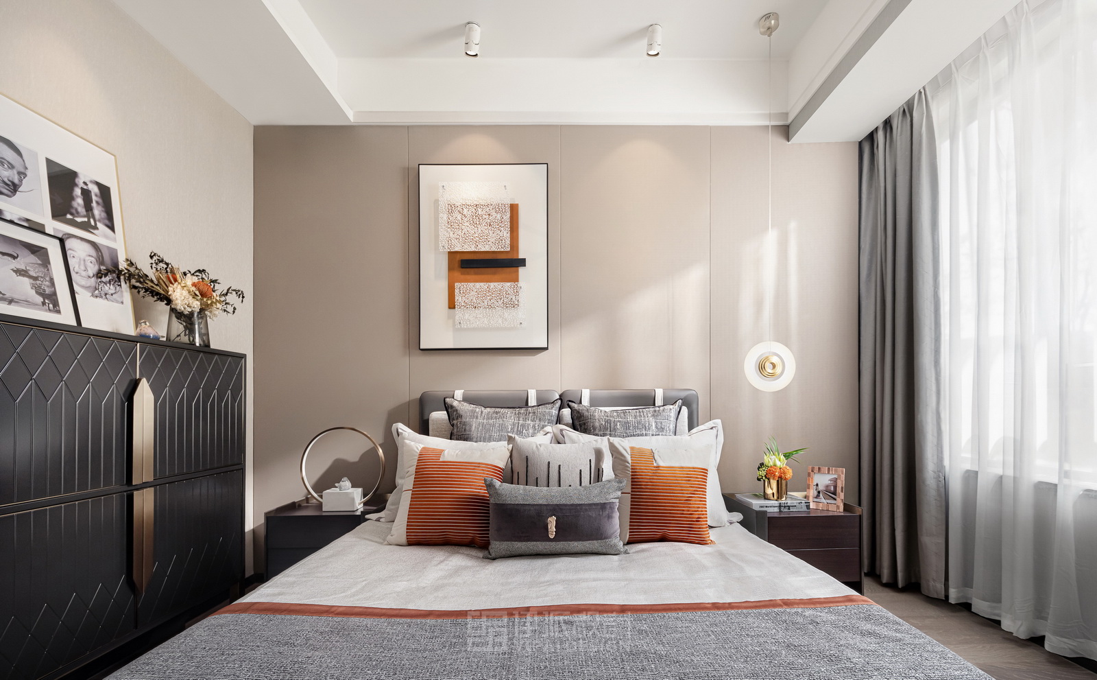 本案風(fēng)格為現(xiàn)代港式風(fēng)格,采用時(shí)尚精簡、低調(diào)內(nèi)斂的高級(jí)灰是用于家居裝扮的首選基調(diào)色彩,呈現(xiàn)優(yōu)雅魅力和精致大氣的視覺感官,符合人們對(duì)現(xiàn)代生活的審美需求。同理,作為潮流都市代表色之一的暖橙,伊派設(shè)計(jì)在居家設(shè)計(jì)中的運(yùn)用中,讓空間張揚(yáng)不浮夸、經(jīng)典且時(shí)尚,成為永恒不變的奢侈品味。